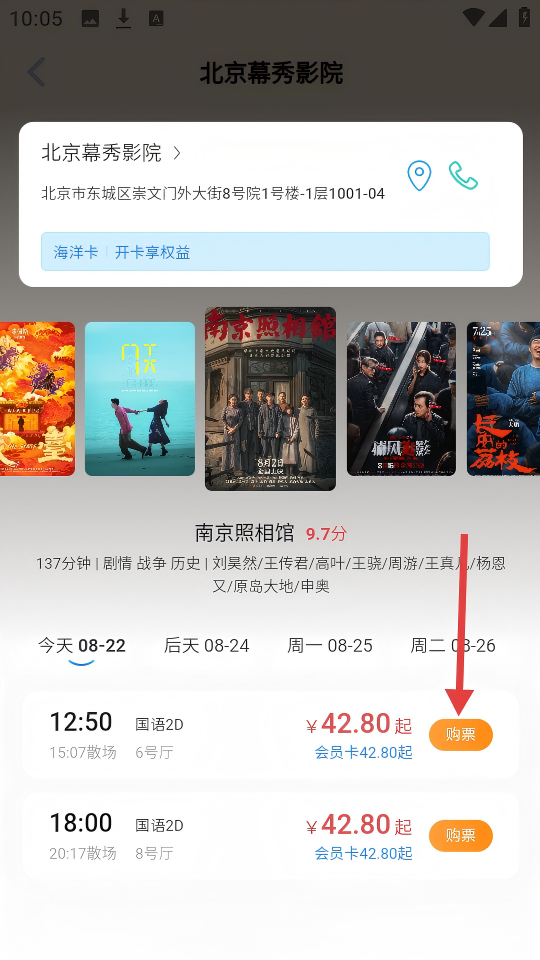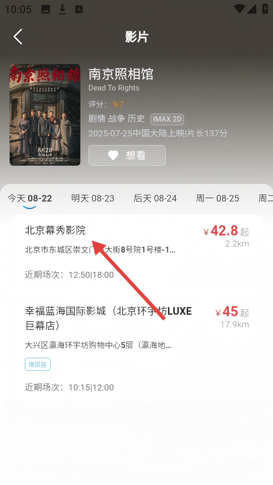 2、在【南京照相館】影片詳情頁,選擇【北京幕秀影院】進入場次選擇。
