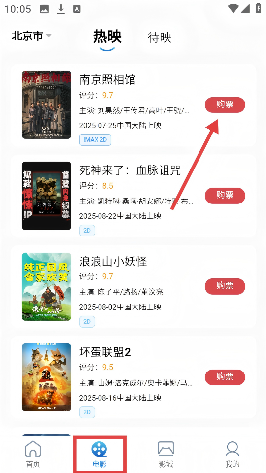 1、進入【電影】頁面,點擊熱映影片【南京照相館】右側(cè)的【購票】按鈕。