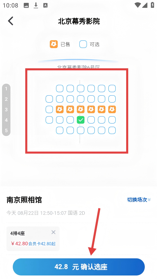 4、在選定北京幕秀影院6號廳的4排4座后,點擊底部藍色的【42.8元確認選座】按鈕。