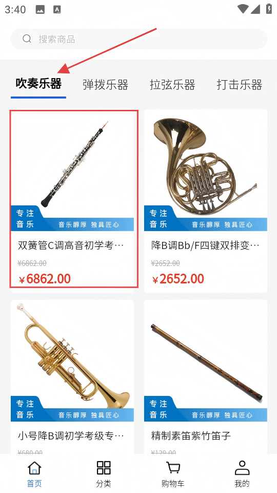1、進入首頁,在【吹奏樂器】分類下,找到并點擊需要的商品卡片。