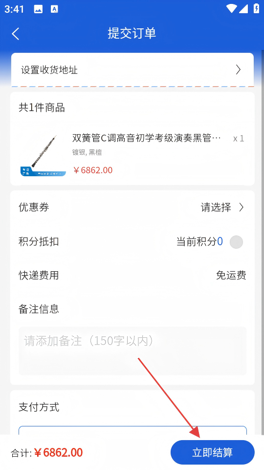 4、進入提交訂單頁,設置收貨地址等信息后,點擊底部【立即結算】完成下單。