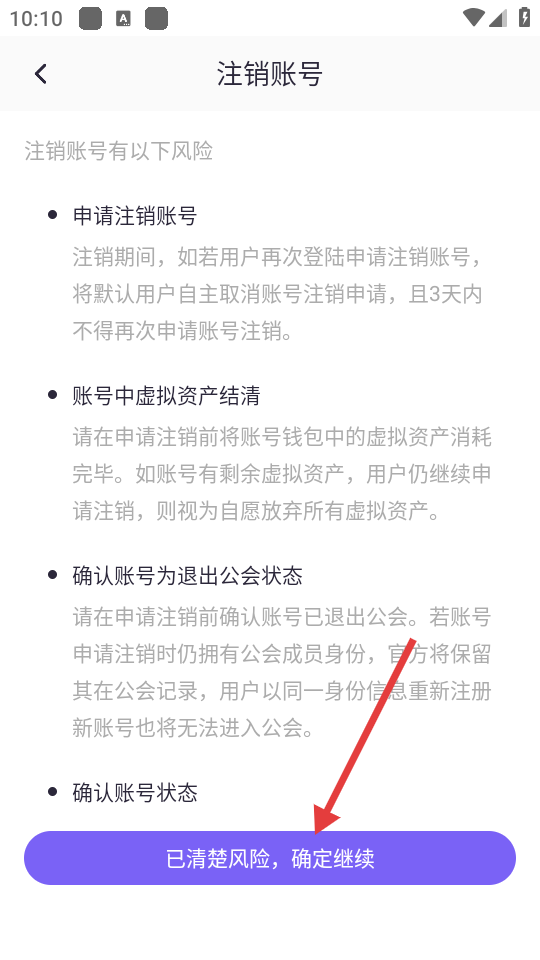 3、在注銷(xiāo)賬號(hào)風(fēng)險(xiǎn)提示頁(yè)面,仔細(xì)閱讀注銷(xiāo)風(fēng)險(xiǎn)后,點(diǎn)擊【已清楚風(fēng)險(xiǎn),確定繼續(xù)】按鈕。