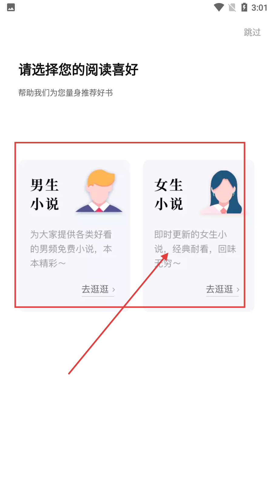 1、進入軟件后,可選擇【男生小說】或【女生小說】分類,點擊“去逛逛”進入對應(yīng)小說專區(qū)。