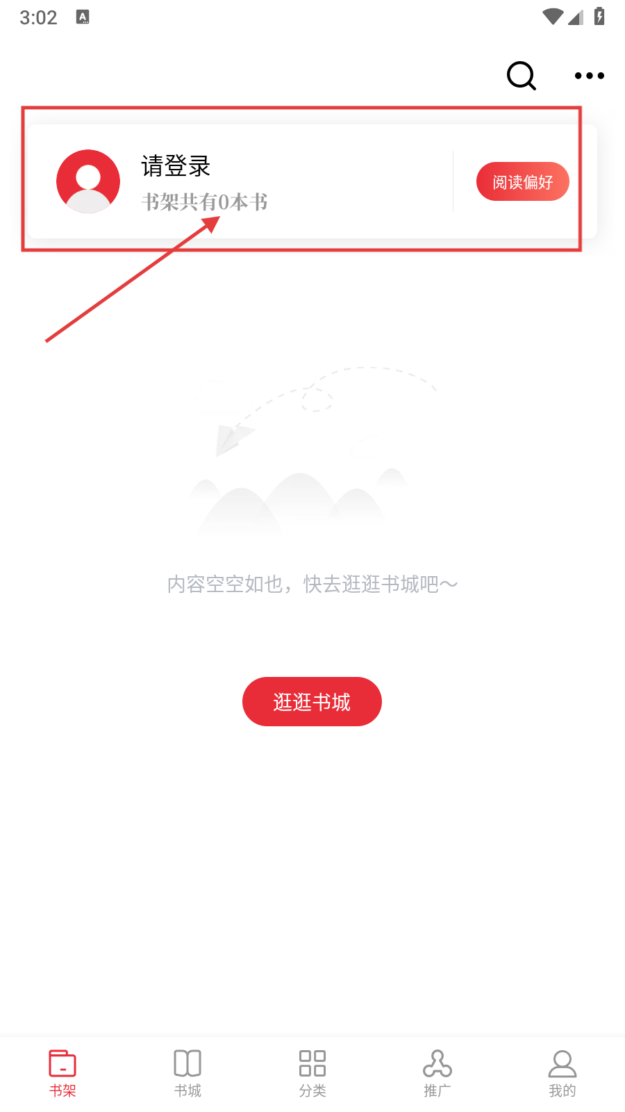 3、在書架頁面,點擊【請登錄】按鈕,進入登錄流程。