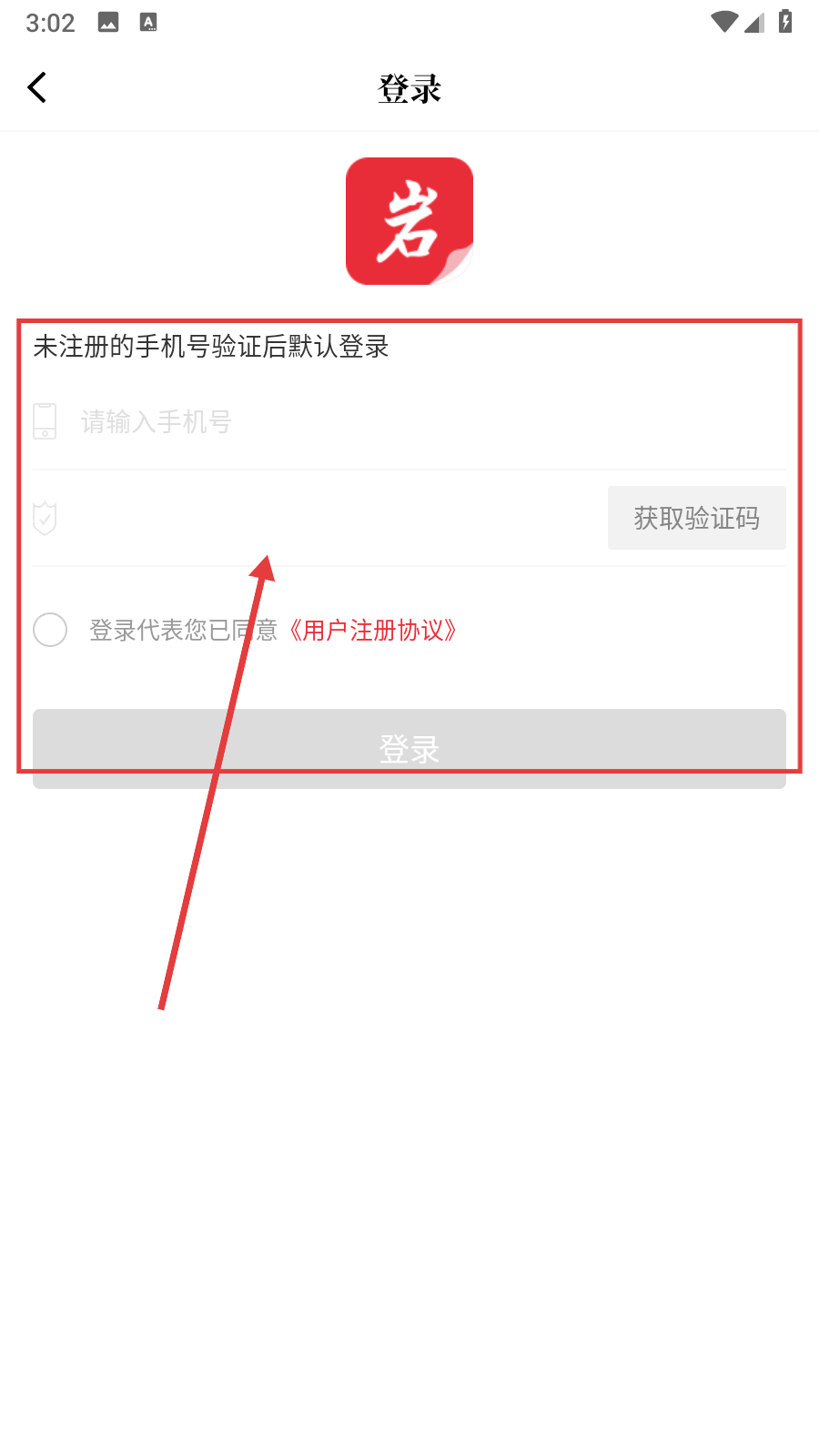 4、進入登錄頁后,輸入手機號,獲取驗證碼,勾選同意《用戶注冊協(xié)議》,再點擊【登錄】按鈕完成登錄。
