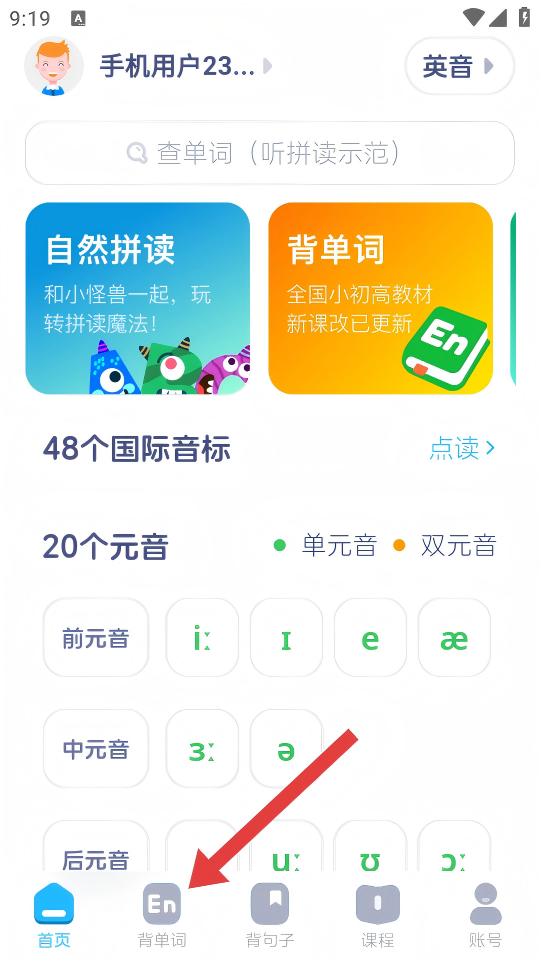 1、打開英語音標(biāo)APP,點(diǎn)擊底部導(dǎo)航欄中的【背單詞】選項(xiàng),進(jìn)入背單詞相關(guān)頁面。