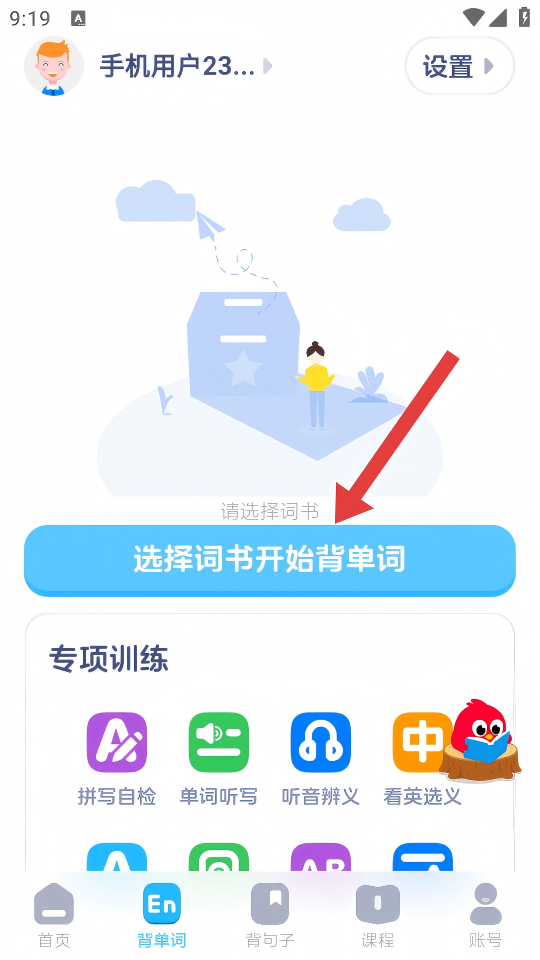 2、在背單詞頁面,點(diǎn)擊【選擇詞書開始背單詞】按鈕,準(zhǔn)備挑選詞書。