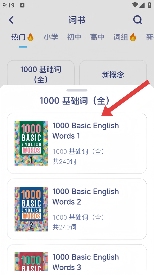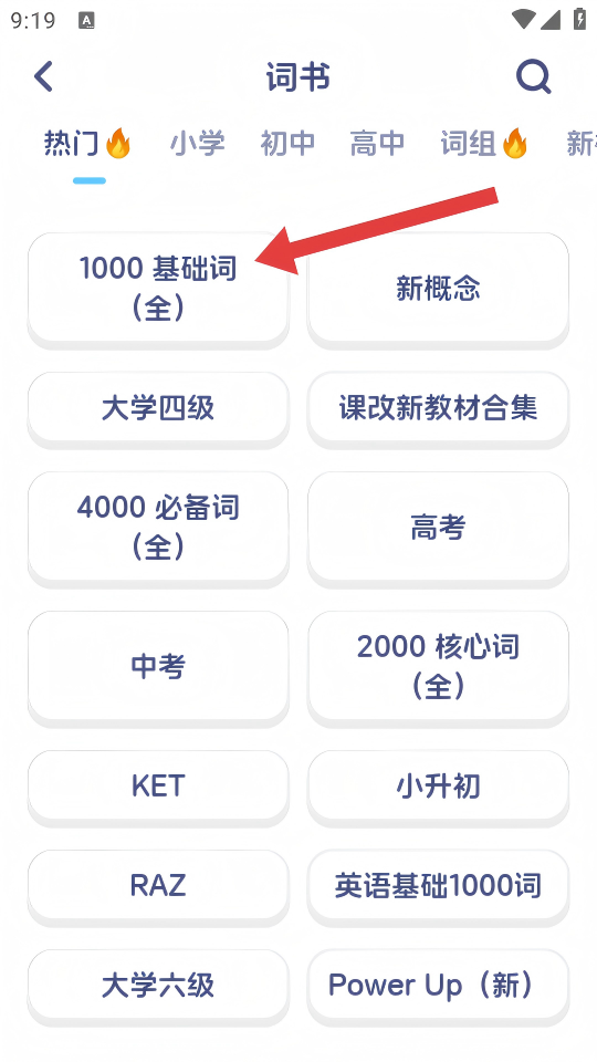 3、在詞書列表中,找到并點(diǎn)擊【1000-基礎(chǔ)詞(全)】這類適合自己的詞書。