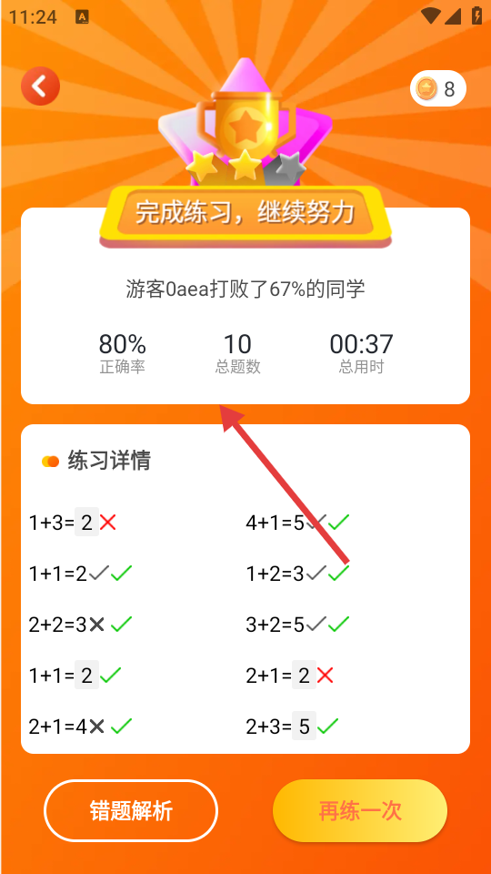 4、練習(xí)結(jié)束后,會(huì)顯示練習(xí)結(jié)果反饋,可查看正確率等信息。