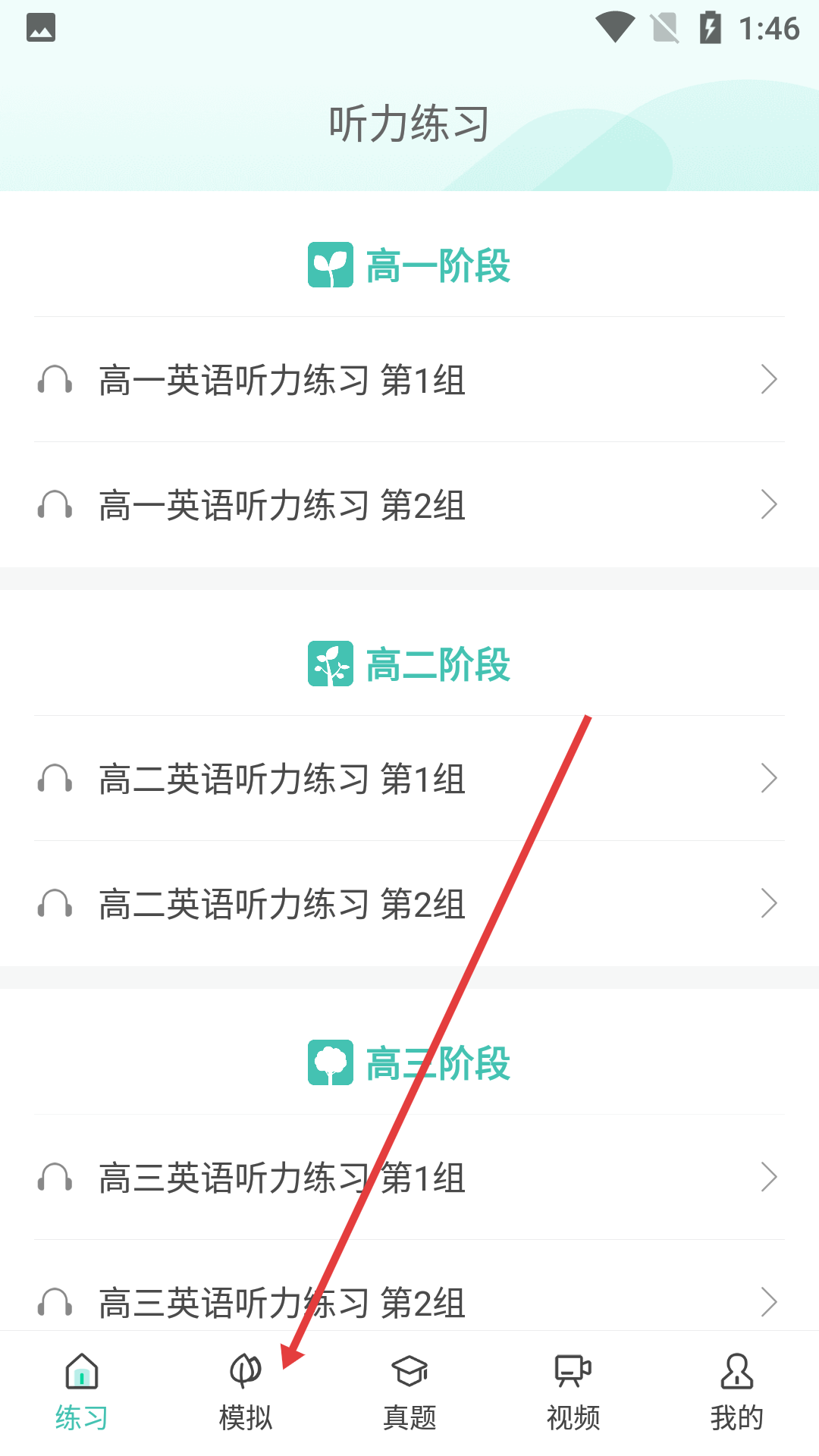 1、點擊頁面底部【模擬】選項,進(jìn)入高考聽力模擬頁面。