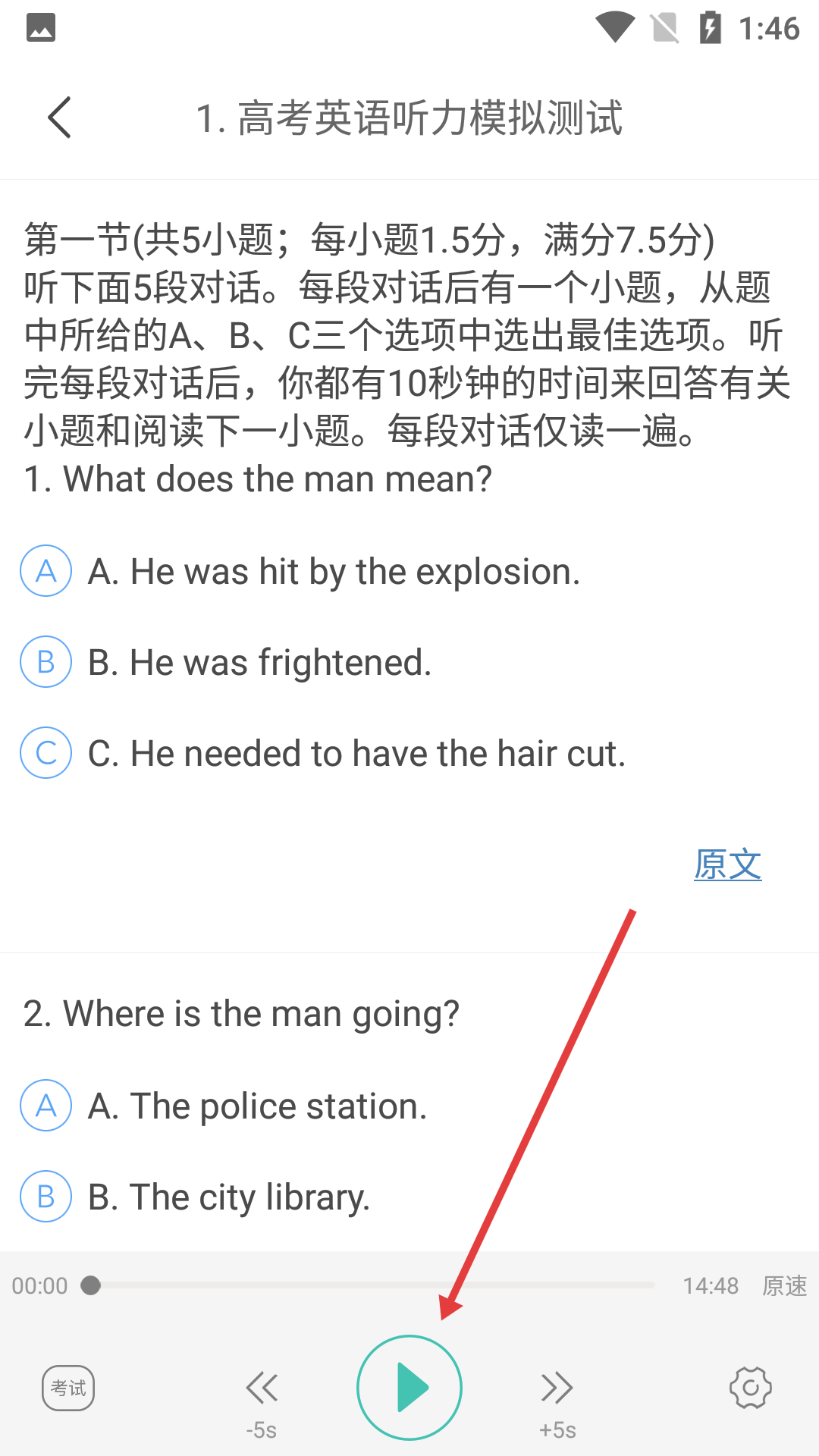 4、在測試題頁面,點擊底部播放按鈕,即可播放聽力音頻并作答。