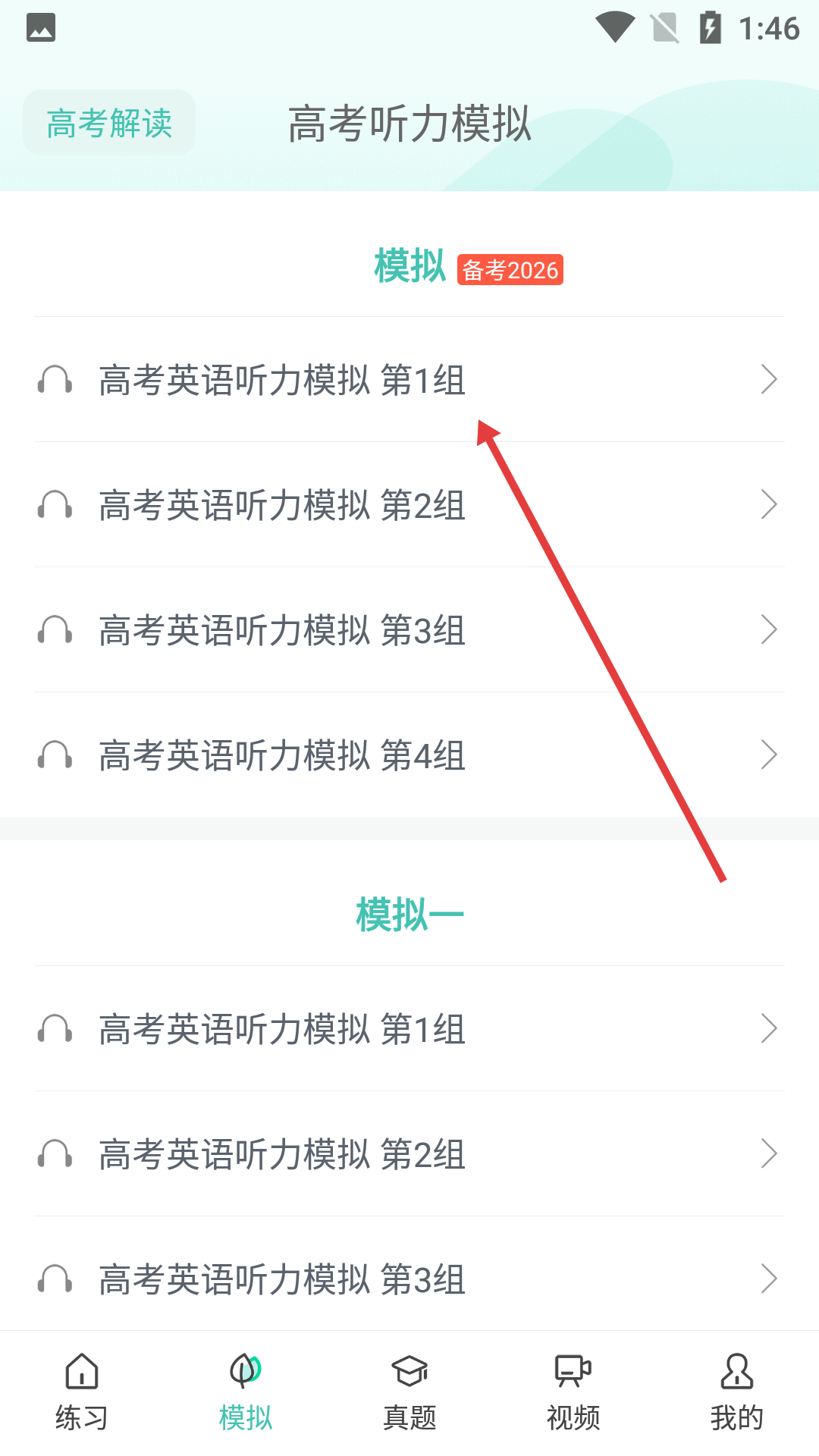 2、在高考聽力模擬頁面,點擊【高考英語聽力模擬第1組】選項。