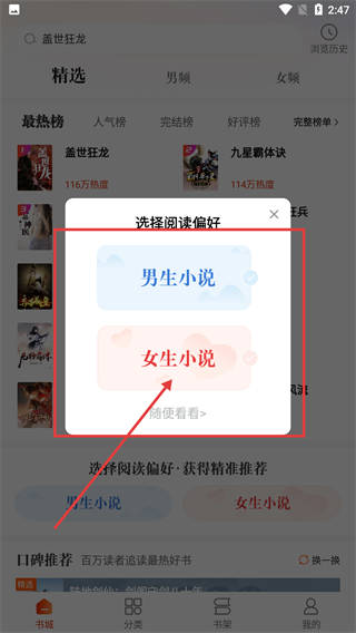 1、選擇【女生小說】,可進(jìn)入女頻頁面,查看女頻相關(guān)小說榜單。