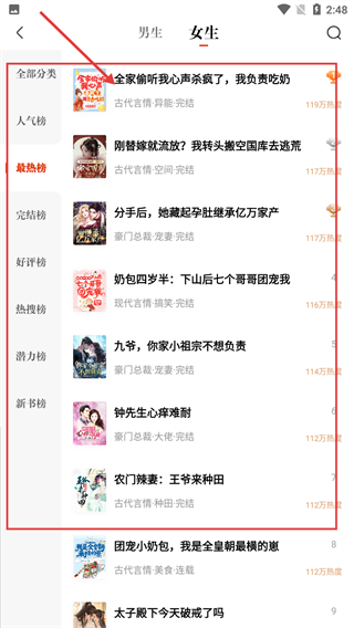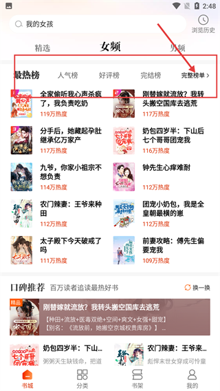 2、在女頻頁面,點(diǎn)擊【完整榜單】,能進(jìn)入女生分類的榜單頁面。