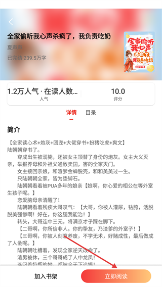 4、進(jìn)入小說詳情頁后,點(diǎn)擊【立即閱讀】按鈕,即可開始閱讀該小說。