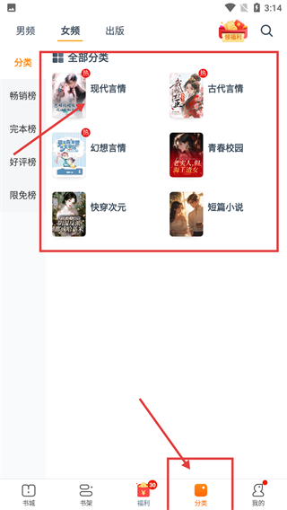 1、點(diǎn)擊底部【分類】,進(jìn)入女頻分類頁面,可選擇【現(xiàn)代言情】等分類。