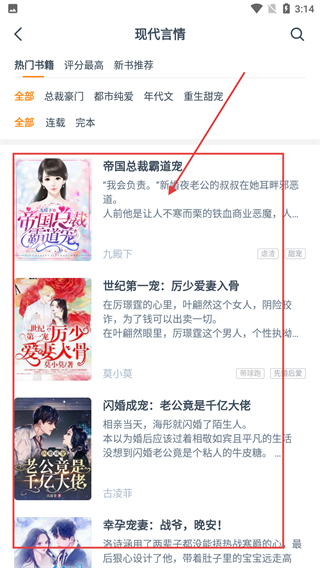 2、進(jìn)入【現(xiàn)代言情】分類頁面,可瀏覽《帝國總裁霸道寵》等熱門書籍。
