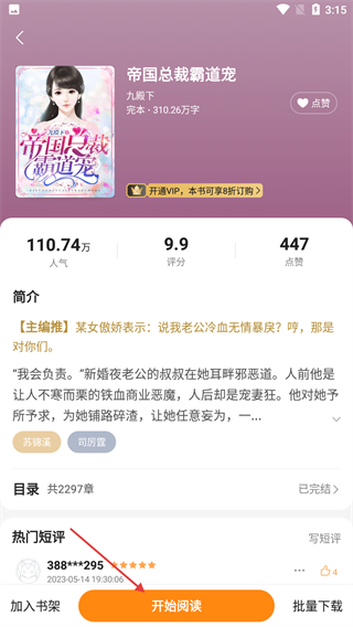 3、比如點(diǎn)擊《帝國總裁霸道寵》進(jìn)入詳情頁,可查看人氣、評分,點(diǎn)擊【開始閱讀】。