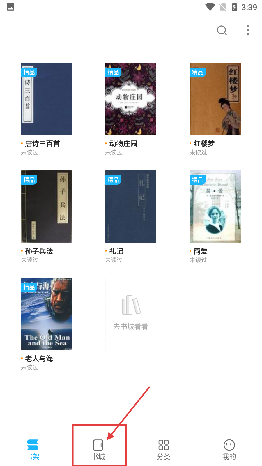 1、點(diǎn)擊底部【書城】,進(jìn)入書城頁面,可瀏覽經(jīng)典名著等分類的書籍。