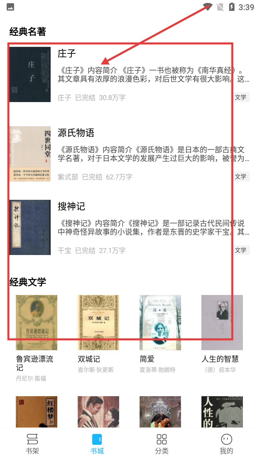 2、在書城經(jīng)典名著分類下,點(diǎn)擊《莊子》,進(jìn)入其詳情頁面查看簡介與目錄。