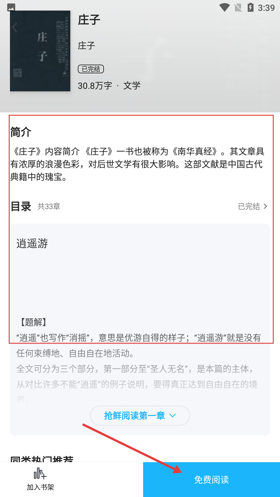 3、在《莊子》詳情頁,點(diǎn)擊【免費(fèi)閱讀】按鈕,進(jìn)入書籍閱讀界面。