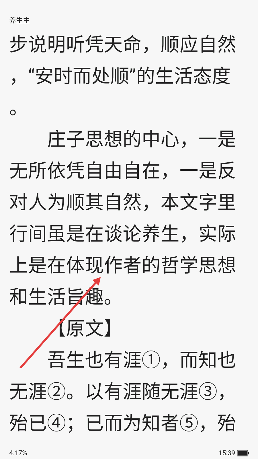 4、進(jìn)入閱讀界面后,即可瀏覽《莊子》中“養(yǎng)生主”等章節(jié)的文字內(nèi)容。