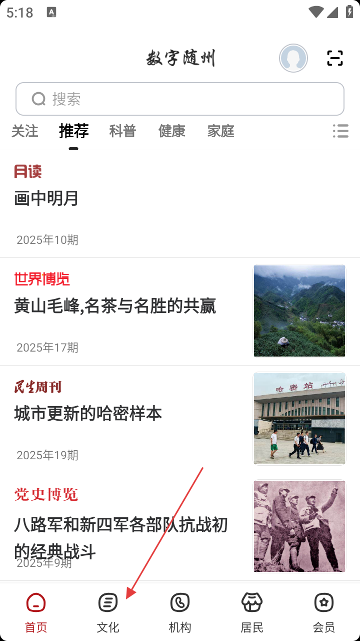 1、打開【數字隨州】APP,在首頁可瀏覽月讀、世界博覽等內容,點擊底部【文化】進入文化頁面。
