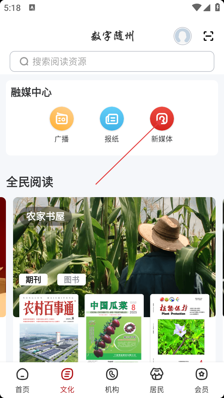 2、在文化頁面,能看到融媒中心、全民閱讀等板塊,點擊【新媒體】。
