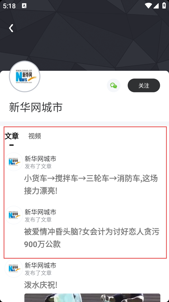 4、進入新華網城市頁面后,可查看其發(fā)布的文章,如【小貨車→攪拌車→三輪車→消防車,這場接力漂亮!】等。