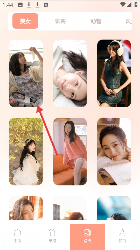 2、進(jìn)入【壁紙】頁面后,選擇【美女】分類,點(diǎn)擊其中一張壁紙圖片。