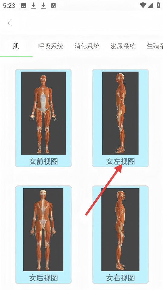 3、在肌肉系統(tǒng)分類下,點擊【女左視圖】,查看對應(yīng)的人體肌肉結(jié)構(gòu)。