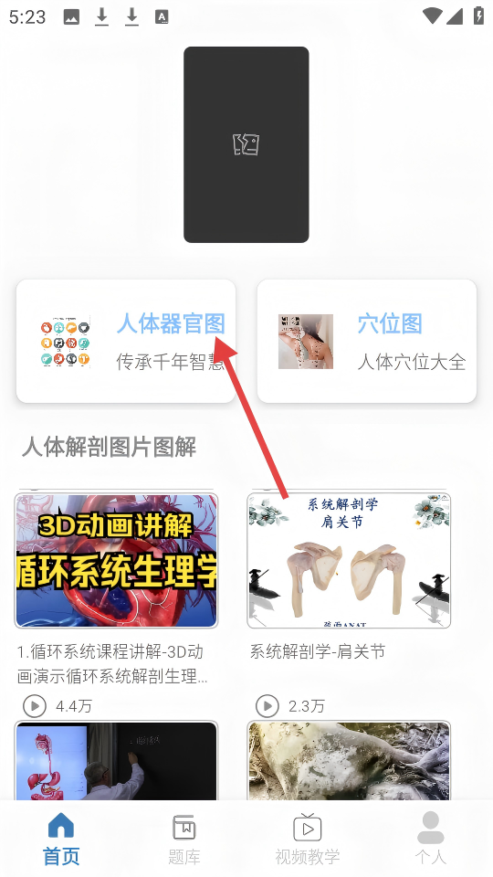 2、進(jìn)入應(yīng)用首頁后,點擊【人體器官圖】選項。