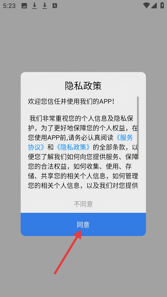 1、在隱私政策彈窗中,點擊【同意】按鈕,進(jìn)入應(yīng)用。
