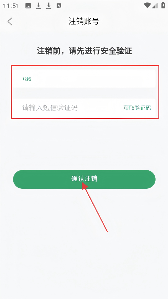 4、在注銷賬號(hào)頁(yè)面,填寫紅框內(nèi)的信息,獲取并輸入短信驗(yàn)證碼后,點(diǎn)擊【確認(rèn)注銷】按鈕。
