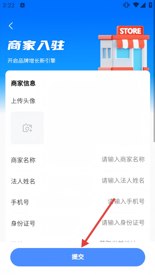 4、填寫商家頭像、名稱、法人姓名、手機號、身份證號等信息后,點擊【提交】,完成商家入駐申請。