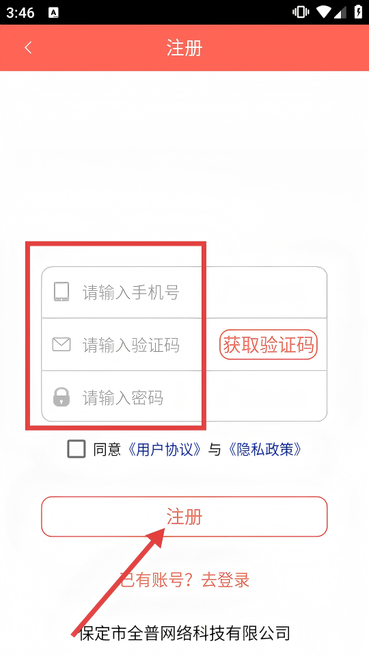4、在注冊(cè)頁(yè)輸入手機(jī)號(hào)、獲取并填寫(xiě)驗(yàn)證碼、設(shè)置密碼,勾選同意《用戶協(xié)議》與《隱私政策》后點(diǎn)擊【注冊(cè)】,完成賬號(hào)注冊(cè)。