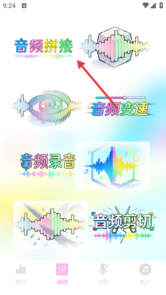 3、在編輯功能選擇頁面,點擊【音頻拼接】,進(jìn)入音頻拼接操作頁面。