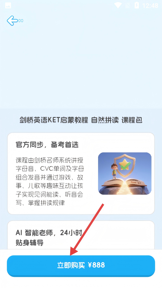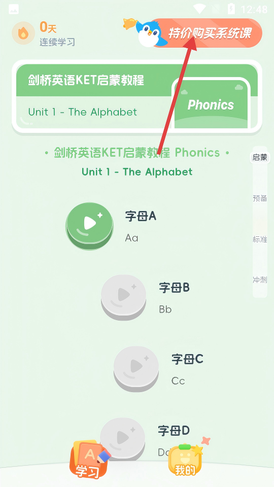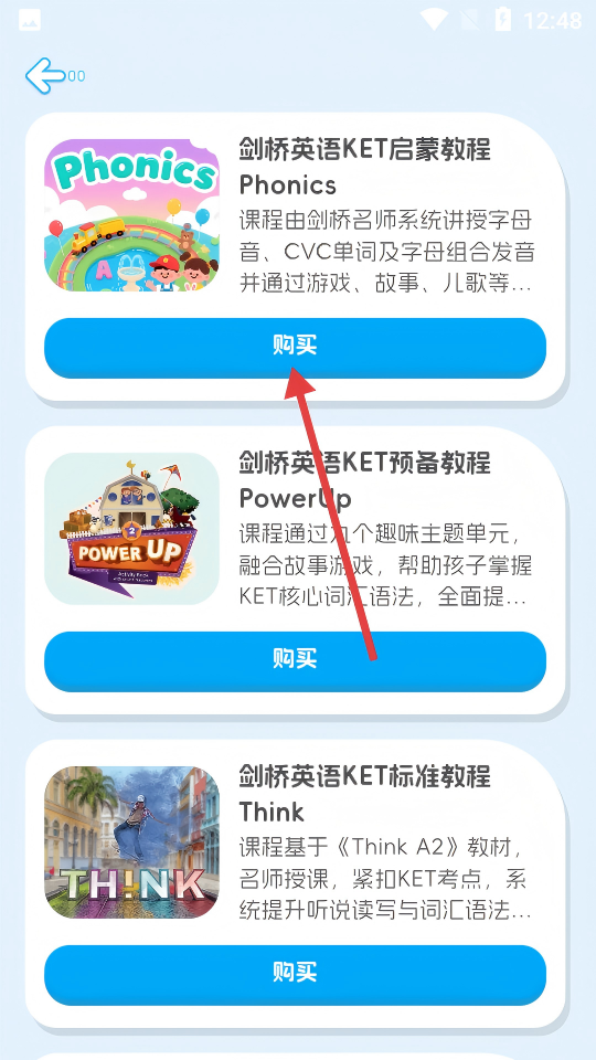 2、在課程選擇頁,找到【劍橋英語KET啟蒙教程-Phonics】,點(diǎn)擊其下方【購買】按鈕。