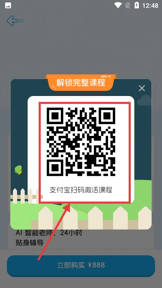 4、此時(shí)會(huì)彈出“解鎖完整課程”的二維碼彈窗,用支付寶掃碼即可激活課程。