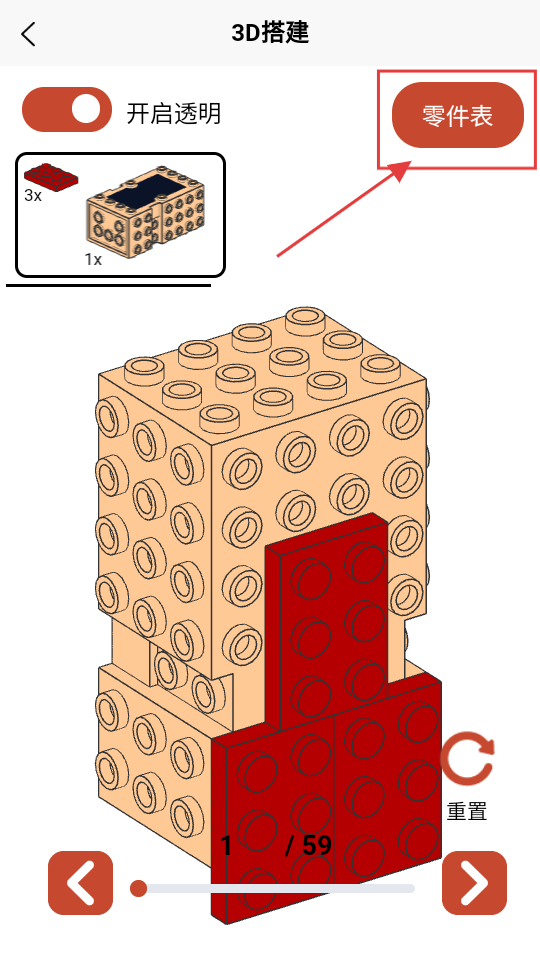 2、進入3D搭建頁面后,點擊【零件表】按鈕,就能查看所需零件的種類和數(shù)量,方便準備零件。
