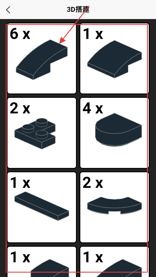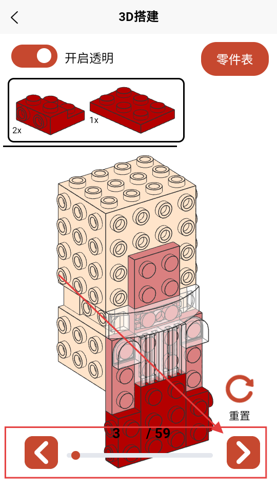 4、準備好零件后,按照3D搭建頁面的步驟,點擊左右箭頭切換步驟,一步步進行搭建就好啦。
