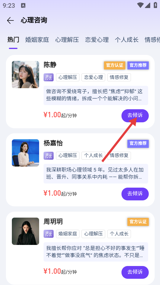 3、在心理咨詢頁面,選擇心儀的咨詢師(如陳靜),點擊【去傾訴】按鈕。