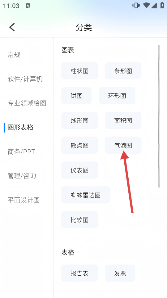 2、進(jìn)入分類頁(yè)面后,在“圖形表格”分類下選擇【氣泡圖】。