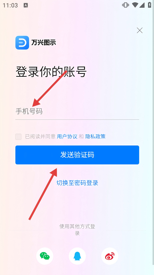 4、若需使用模板,在登錄窗口輸入手機(jī)號(hào)碼,勾選協(xié)議后點(diǎn)擊【發(fā)送驗(yàn)證碼】完成登錄。