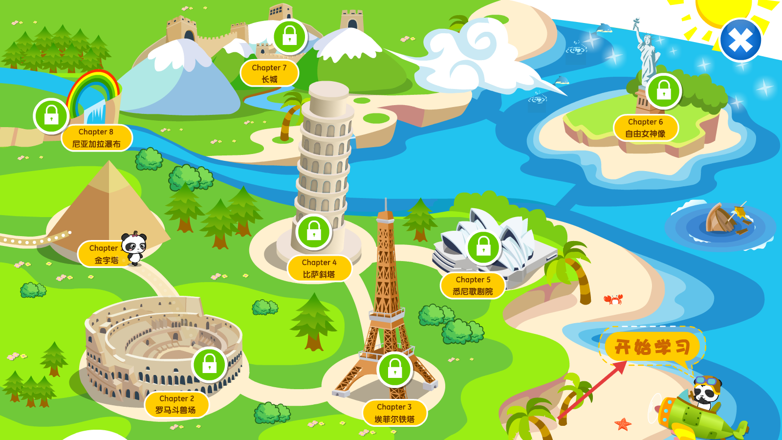 2、在學(xué)習(xí)場景地圖中,點(diǎn)擊【開始學(xué)習(xí)】,進(jìn)入熊貓英語學(xué)堂的課程介紹界面。