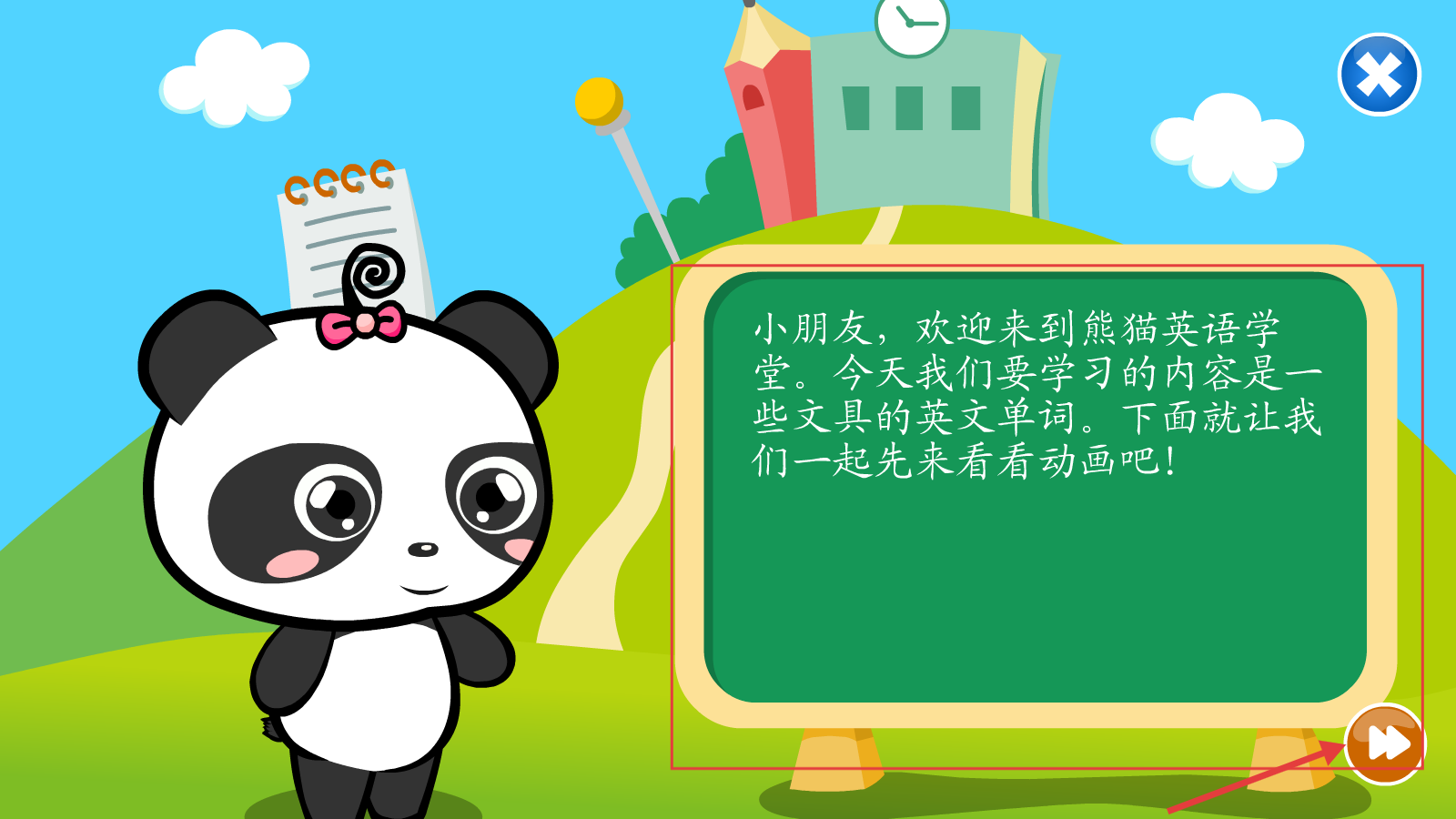 3、在課程介紹界面,查看學(xué)習(xí)文具英文單詞的提示后,點(diǎn)擊播放按鈕觀看動畫。