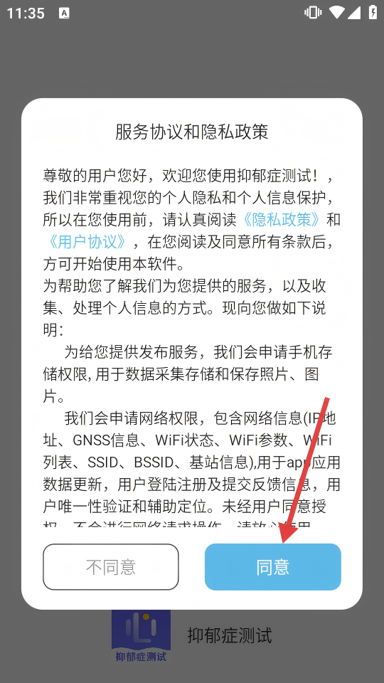 1、打開心理測評APP,在“服務(wù)協(xié)議和隱私政策”彈窗點擊【同意】,進(jìn)入主界面。