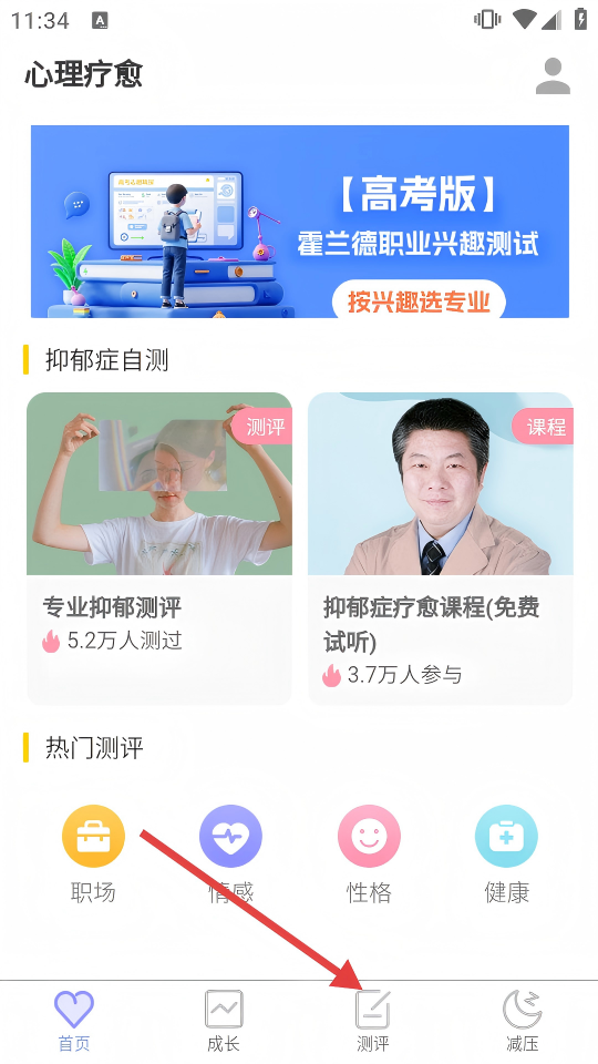 2、在主界面點擊底部【測評】,進(jìn)入測評分類頁面。