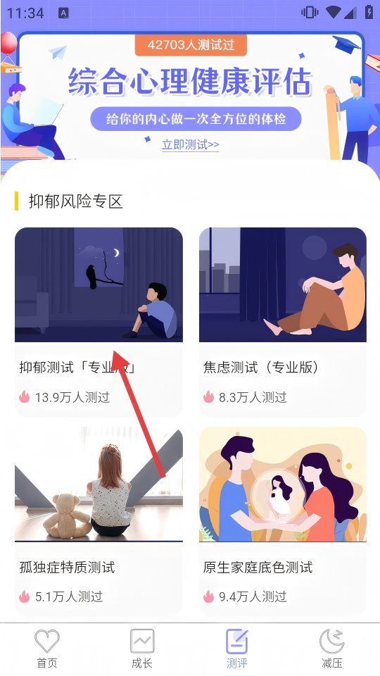 3、在測評分類頁面的“抑郁風(fēng)險專區(qū)”,點擊【抑郁測試「專業(yè)版」】,進(jìn)入登錄頁面。