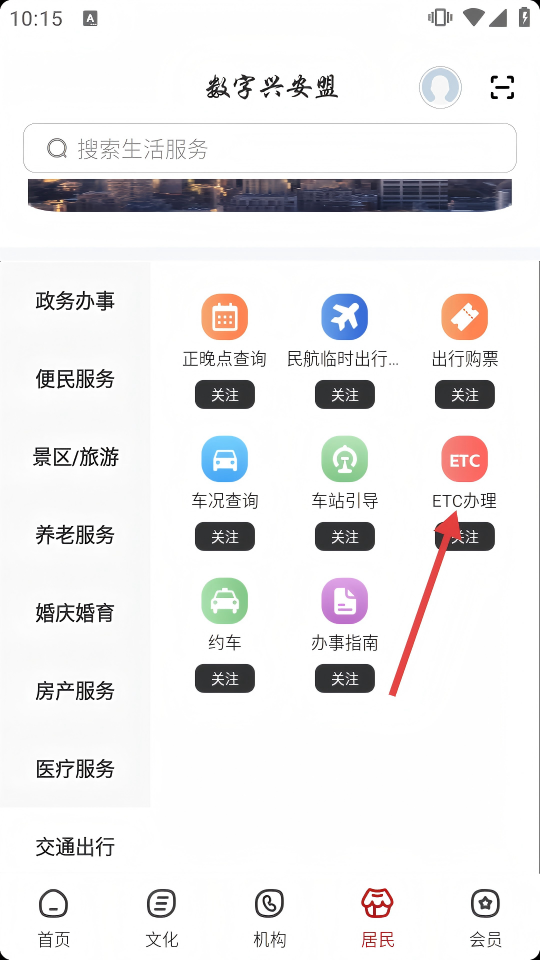 2、在居民服務頁面,點擊【ETC辦理】選項,進入ETC辦理相關界面。